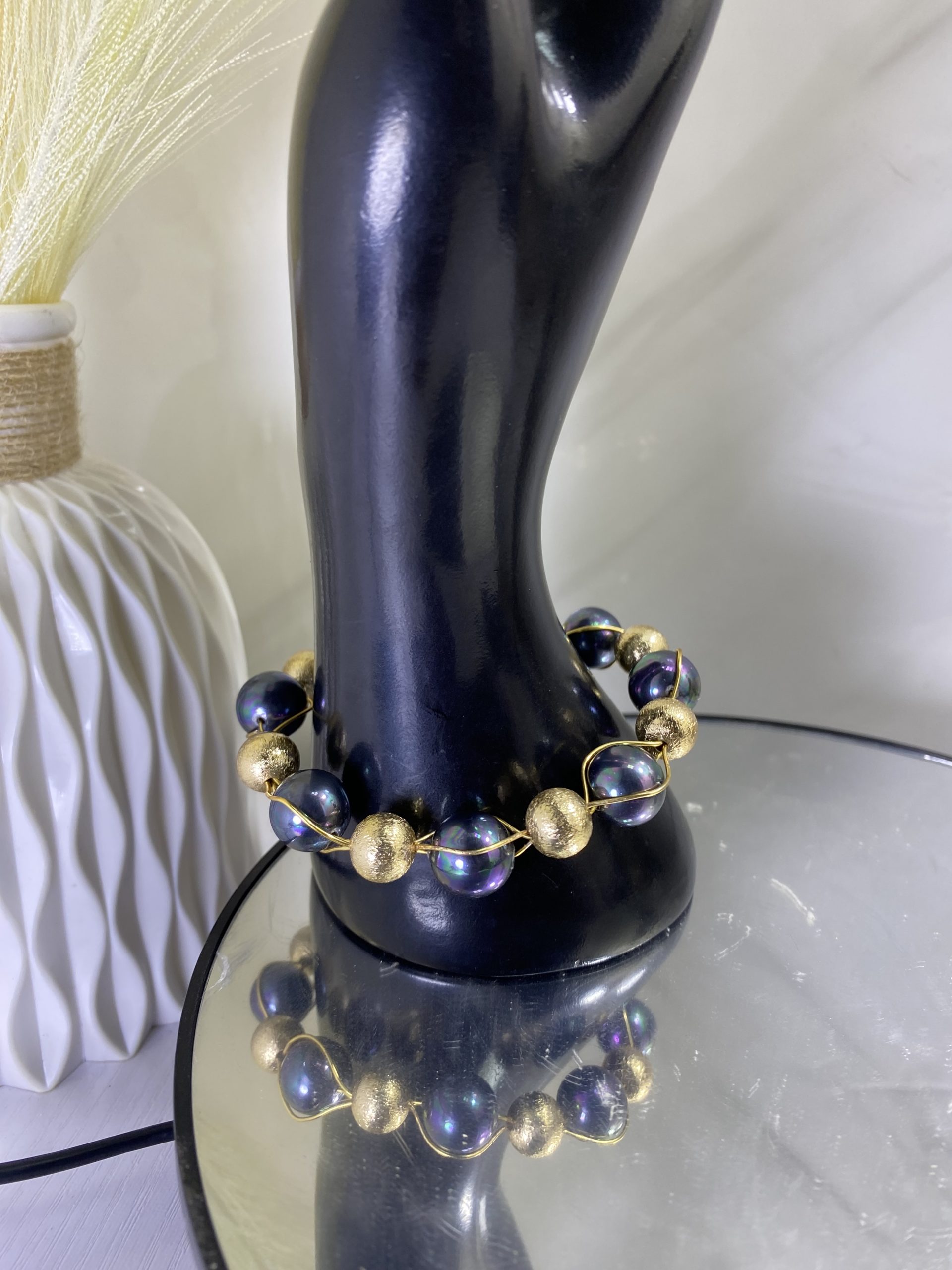 The Evelina Bracelet is a handcrafted piece designed for women who appreciate refined luxury with a modern edge. Featuring a harmonious blend of textured gold beads and deep iridescent accents, this bracelet delivers a rich, dimensional shine that shifts beautifully with light.