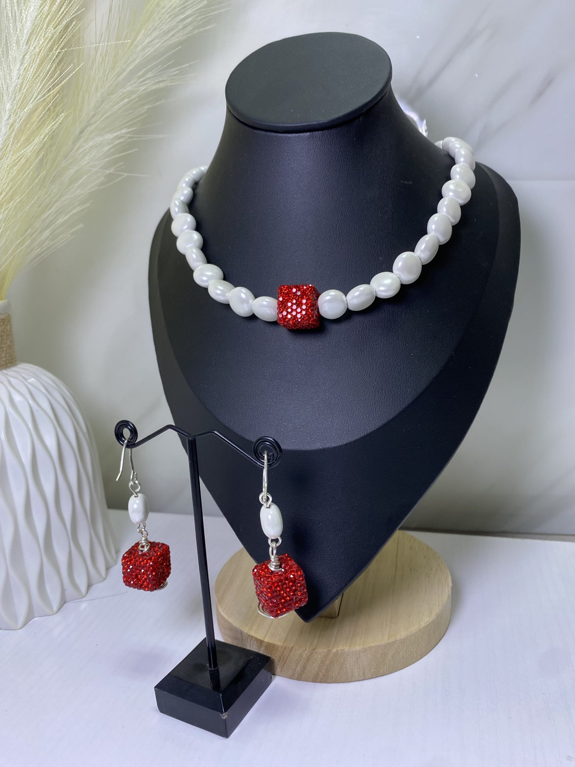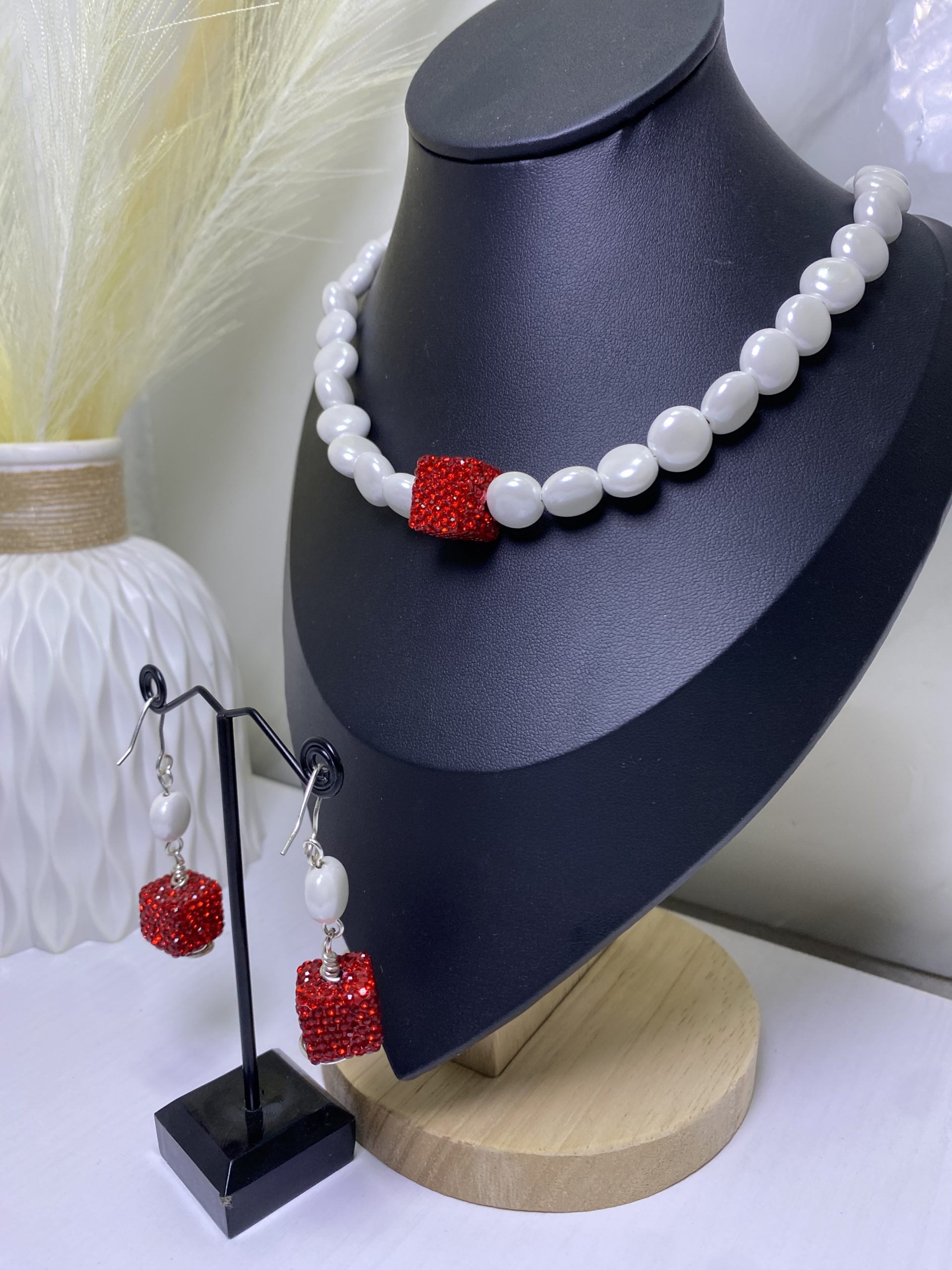 • Pearl statement necklace with red crystal centerpiece