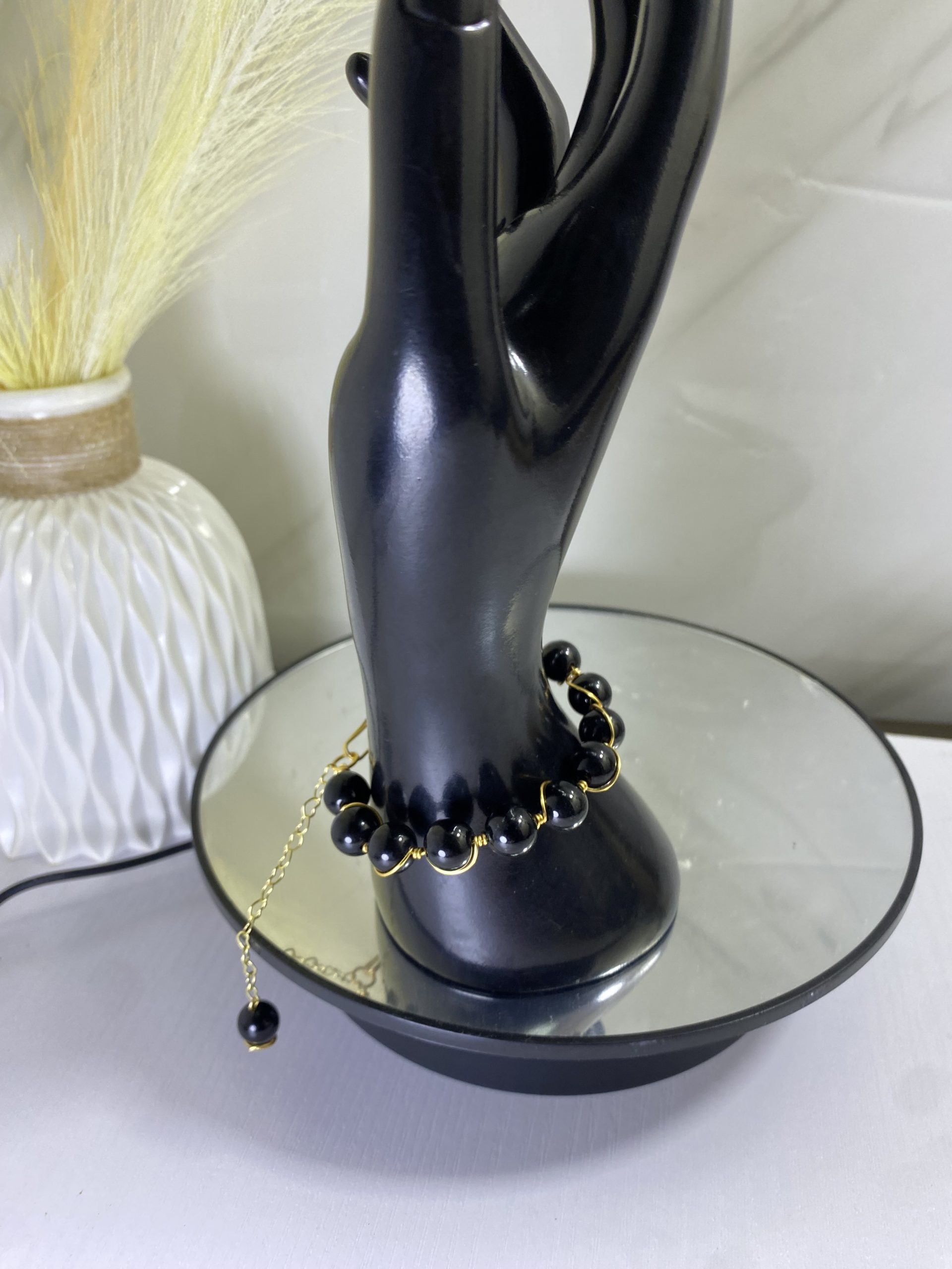 A handcrafted statement bracelet featuring glossy black beads paired with gold-tone wire detailing. Designed for bold elegance and timeless sophistication.