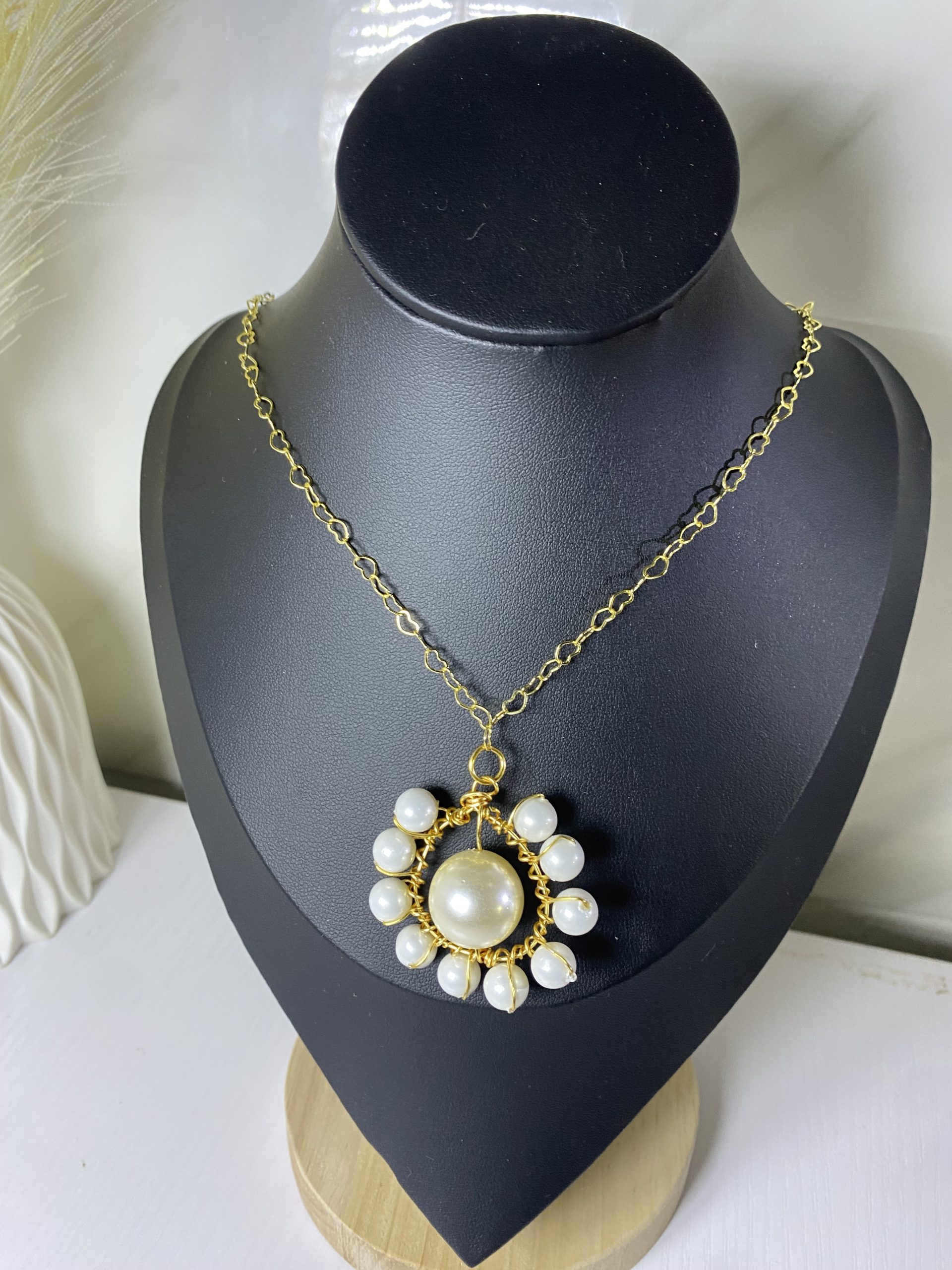 The Solenne Necklace is a handcrafted statement piece designed to stand out with grace and confidence. Featuring a luminous central pearl encircled by smaller pearls, it creates a soft halo effect that captures light beautifully.