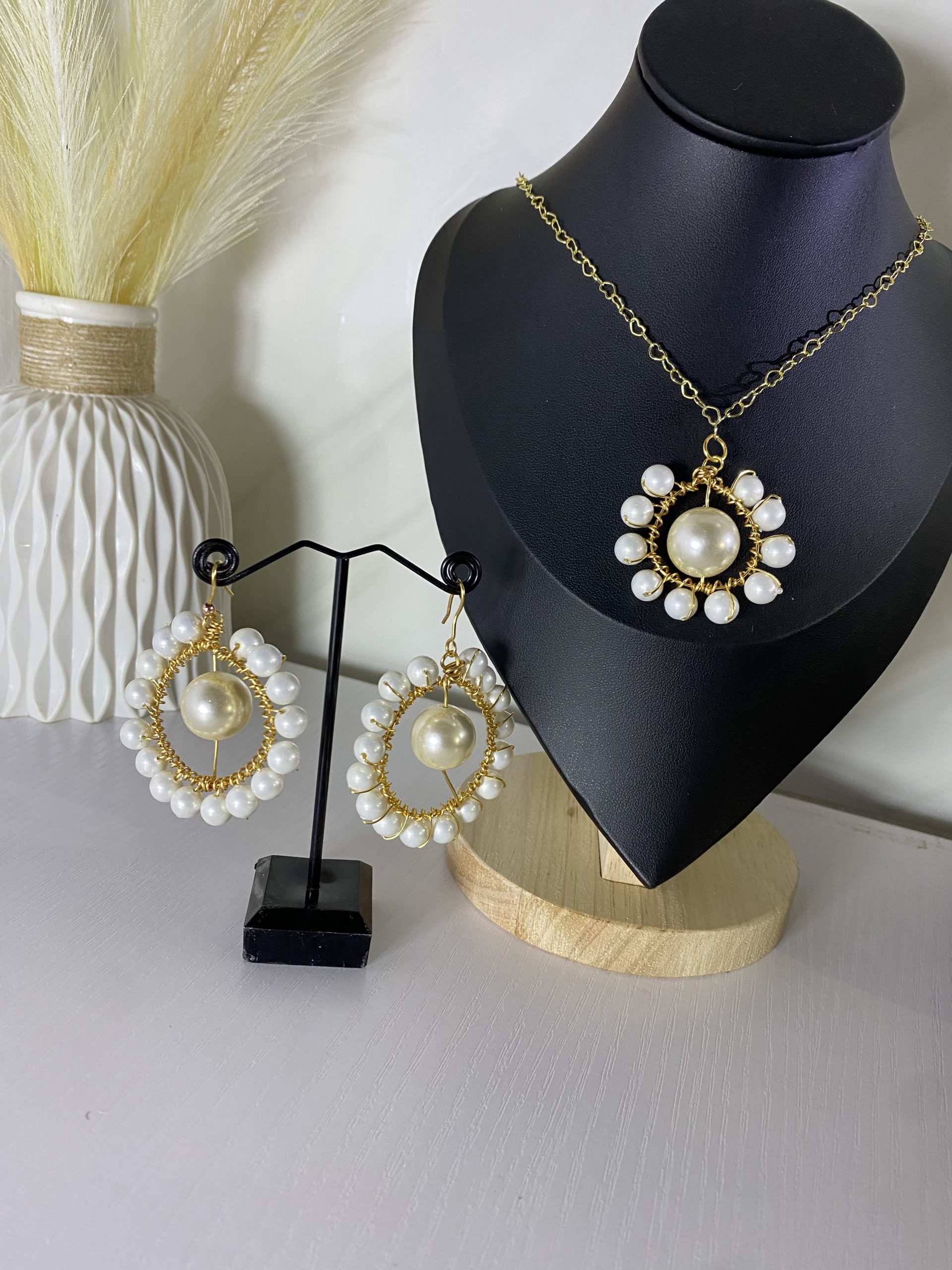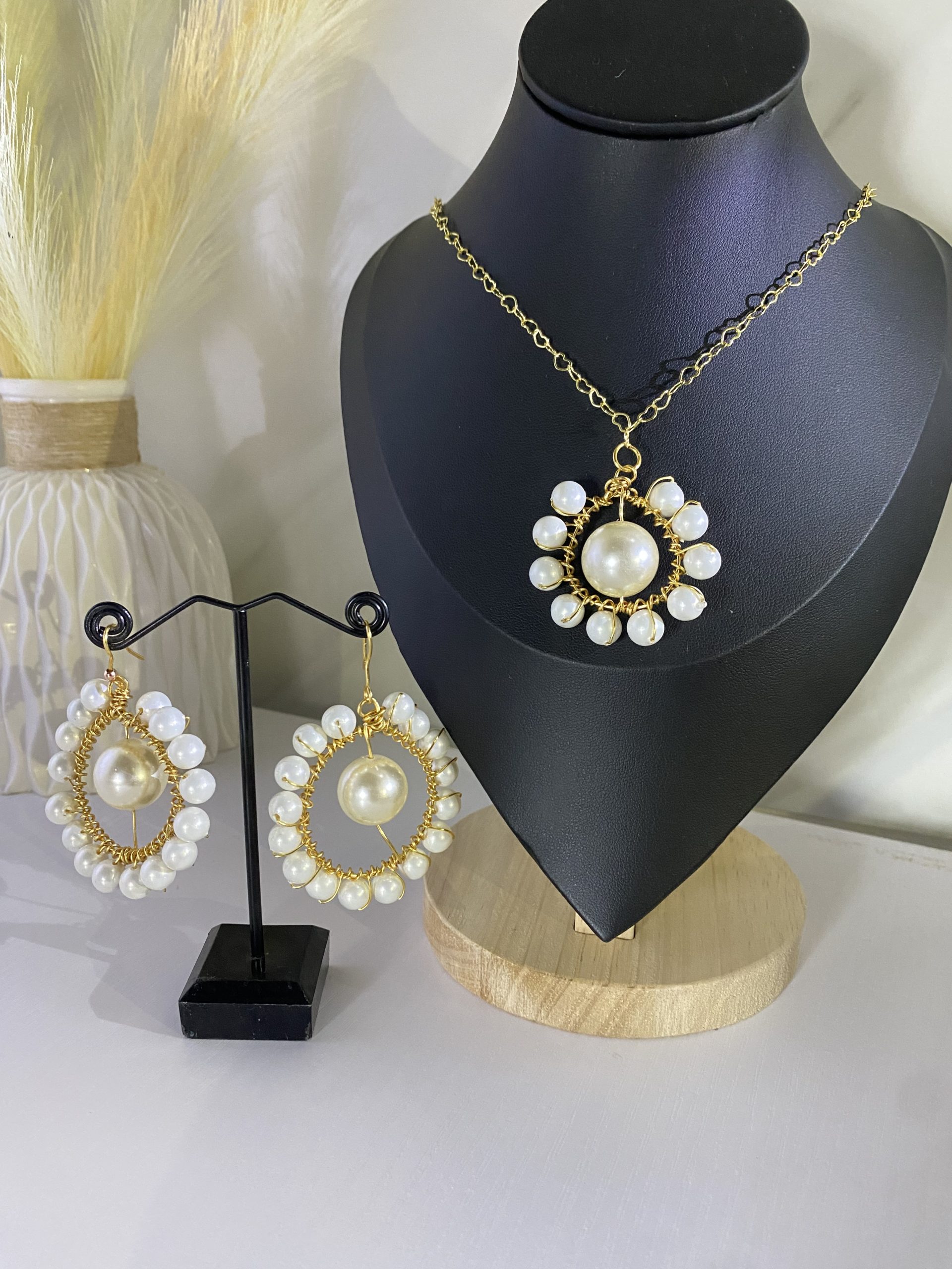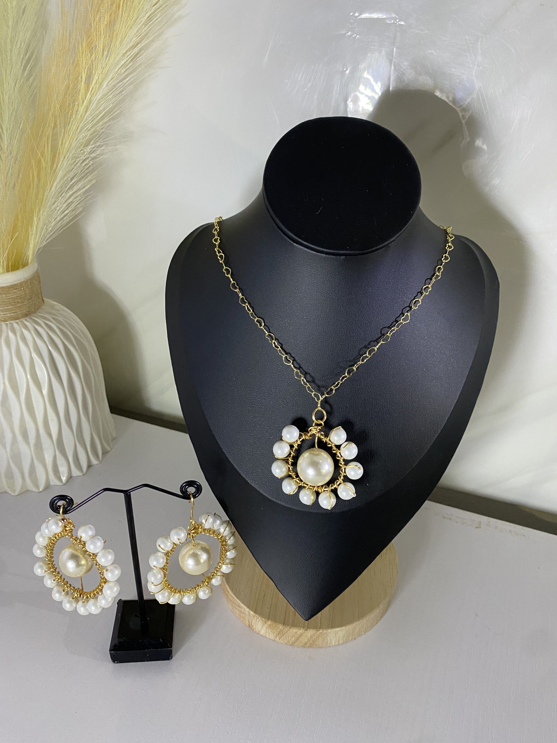 The Solenne Set is a handcrafted jewelry set designed to bring soft luxury to your look. Featuring a single-chain necklace with a round pearl halo pendant and matching pearl hoop earrings, this piece gives you that polished, expensive feel — without doing too much.