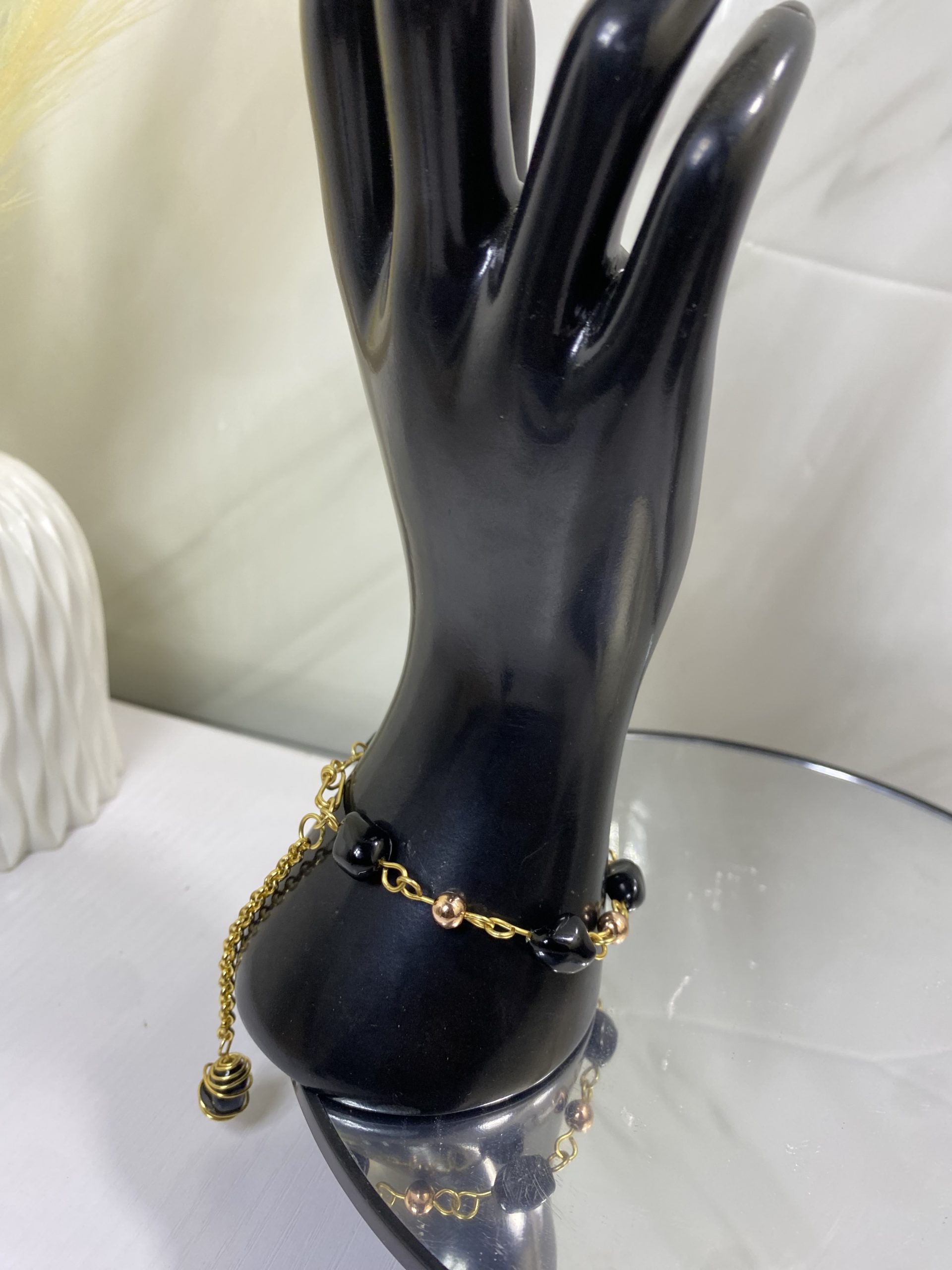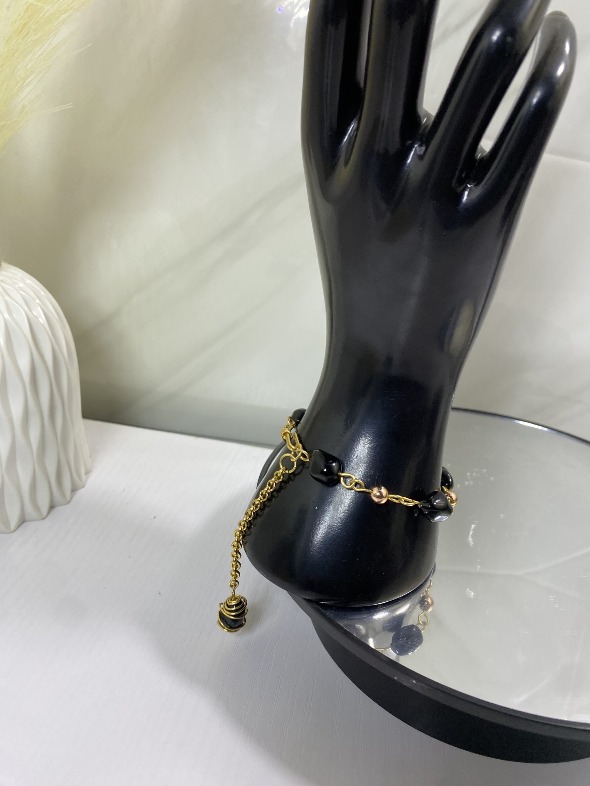 The Virelle Drop Bracelet is designed for the woman who understands that true luxury is in the details. Featuring rich black stones paired with warm gold tones, this piece brings balance, depth, and quiet sophistication to your wrist.