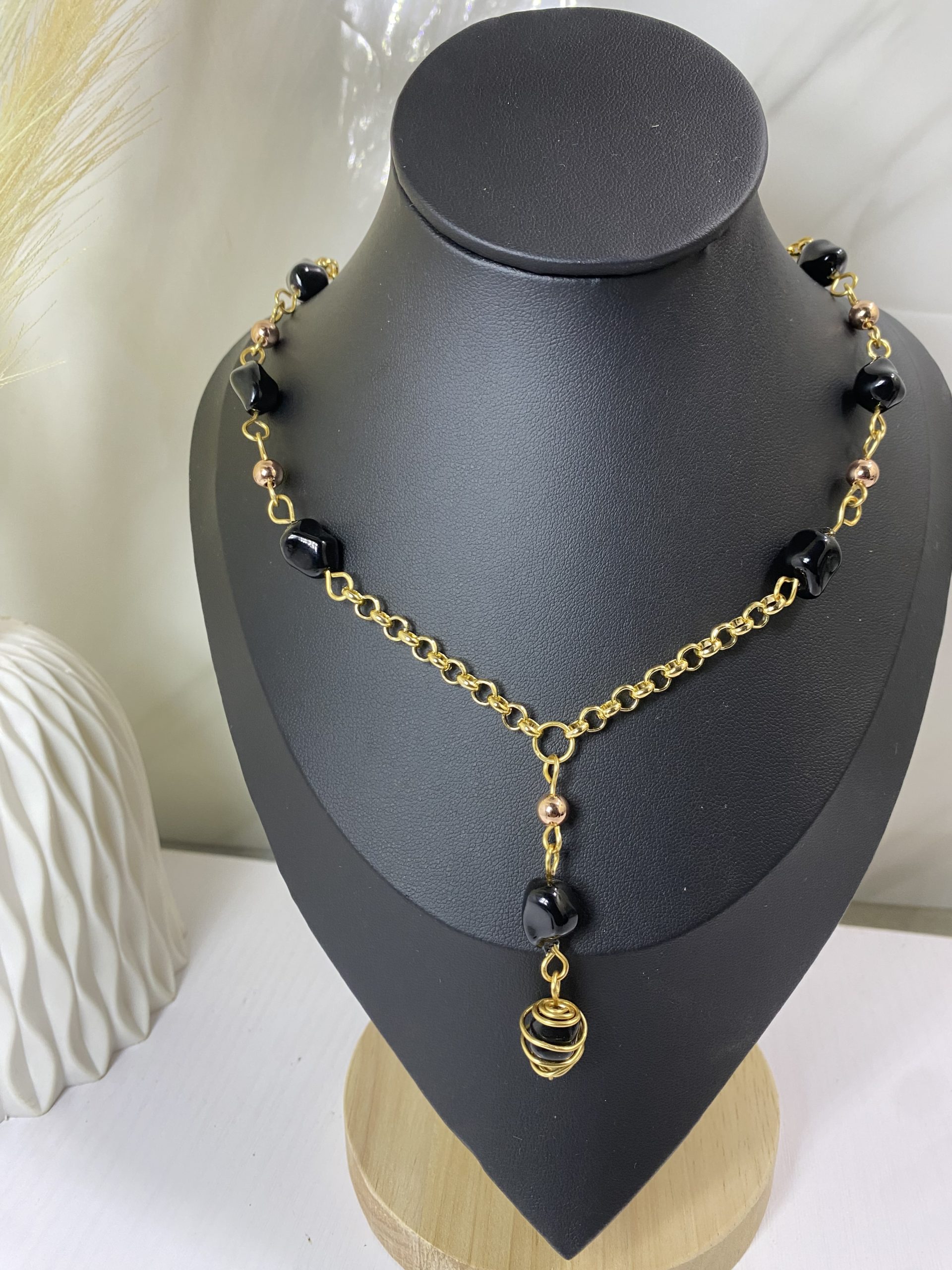 A handcrafted gold-tone necklace featuring bold black stones and a signature drop pendant. Designed for confident elegance and modern luxury styling.