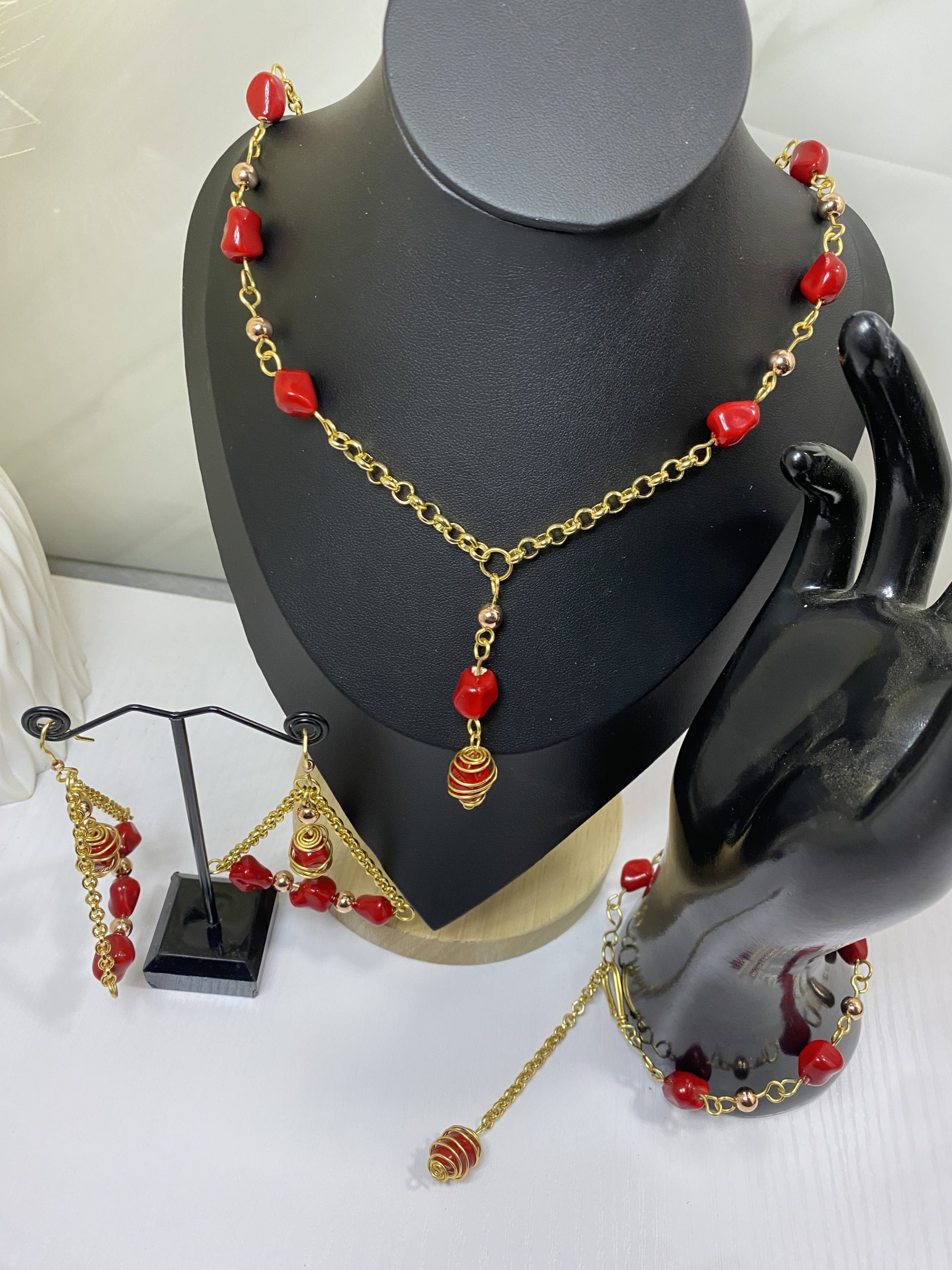 A handcrafted jewelry set featuring rich red stones, gold accents, and an elegant drop design. Created for bold, feminine, and luxurious statement styling.